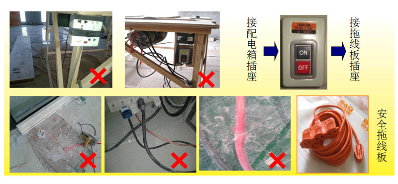臨時(shí)用電必須公司標(biāo)配的配電箱(接入進(jìn)戶配電箱下樁頭),三相接線正確。引線必須固定,并確保內(nèi)部配件(漏電保護(hù)器等)完好,保持箱體內(nèi)外清潔