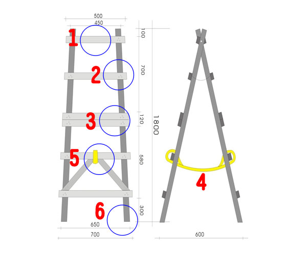 4、架梯雙腿之間的連接材料應(yīng)采用直徑12-15mm的尼龍繩,其長(zhǎng)度以保證雙腿之間的最遠(yuǎn)距離控制在600mm以內(nèi)。