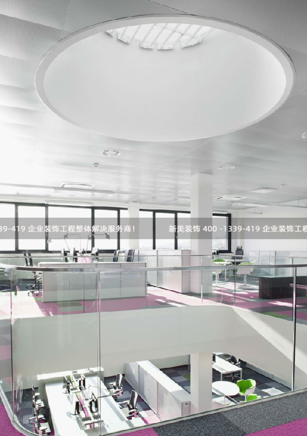 室內(nèi)中庭一條寬敞的洋紅色樓梯將上下貫穿在一起,開敞的空間促進(jìn)員工間的交流與合作。中庭在這里扮演著重要的角色,家具公司精心放置了一些不同類別的家具,以滿足不同需求,可以在這里來一場充滿激烈爭辯的頭腦風(fēng)暴,或者日間的片刻休息躲進(jìn)高靠背沙發(fā)里享受個(gè)人時(shí)光。洋紅、魅紫和新鮮的草綠地毯,將中庭空間裝扮的猶如美麗的調(diào)色盤,優(yōu)雅清新靚麗。